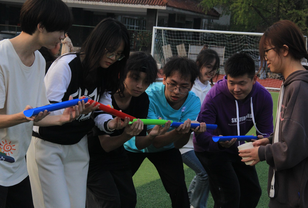 本次活动在灿烂柔和的阳光下拉开帷幕。伴随着主持人徐睿同学的引导,大家积极参与到暖身游戏中来,学联同学们相互贴心按摩、介绍交流。游戏环节,在主持人同教练组的示范下,各小队积极训练,协商战术,无论是展示小队风采各异的“旗帜飘扬”,要求掌握平衡物体能力的“不倒森林”,还是最终考验团队协作能力的“珠行万里”,学联全体成员充满激情、踊跃参与,绿茵草地上充满欢声笑语。