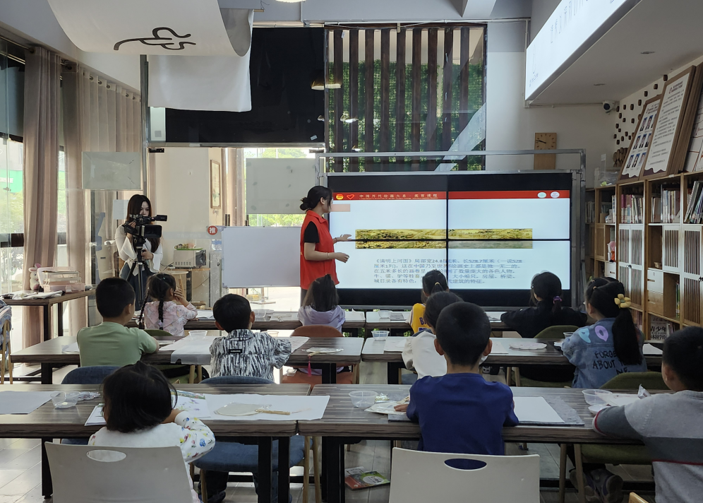首先,团队成员向小朋友们介绍了《清明上河图》的制作材料和绘画用具,带领小朋友们了解笔、墨、纸,砚的基础知识。随后向小朋友介绍画中意象,解读画中蕴含的深刻含义。过程中,团队成员说道:“想要创作一幅好的作品,画家不仅要有高超的绘画技艺,还要有深厚的文化底蕴和艺术修养。为了将哲学思想、文化理念和审美情趣蕴含于作品之中,需要画家有广泛的知识和深刻的见解。”讲解期间,教室安静,小朋友们认真聆听,对中国绘画有了新的认识。