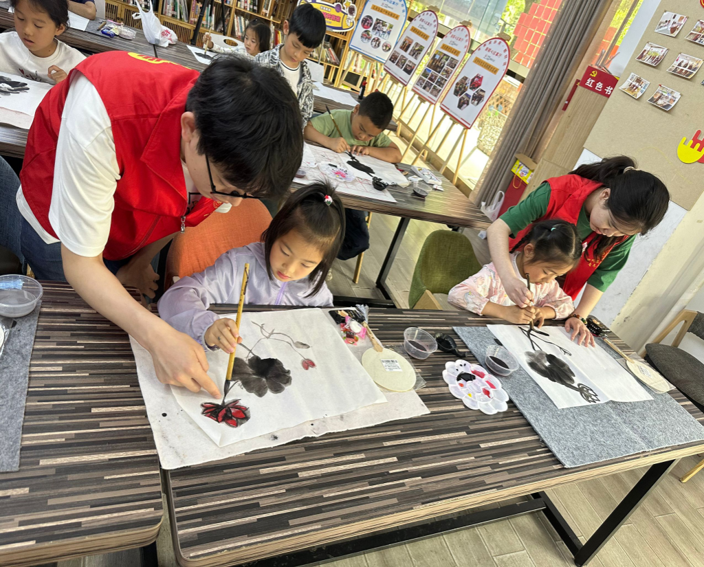 带领小朋友们了解国画基础知识后,团队成员手把手教小朋友一起学习国画“夏荷”的绘制方法。台上,老师一步一步教小朋友如何绘画;台下,团队成员们为小朋友准备材料,并手把手教小朋友绘画。每一个小朋友的眼神中都充满了好奇和期待,迫不及待地想要自己尝试画出一朵美丽的荷花。