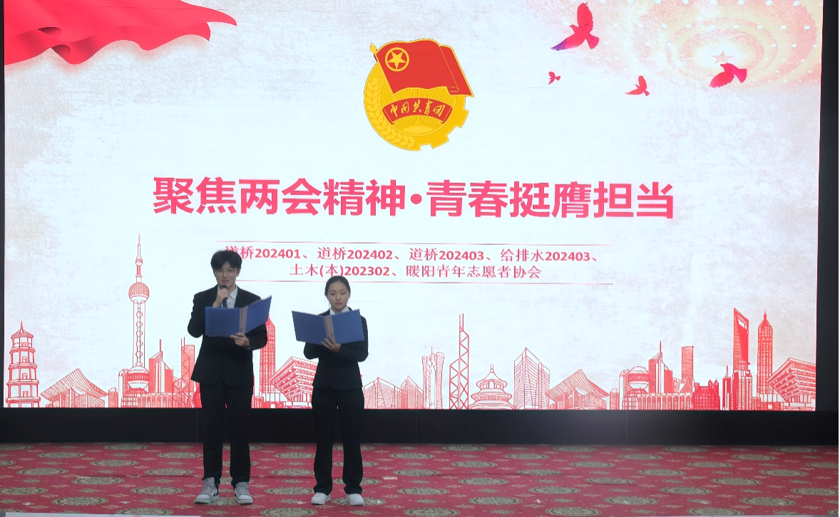 为深入学习贯彻习近平总书记在全国两会期间的重要讲话精神,聚焦用习近平新时代中国特色社会主义思想铸魂育人,把德育贯穿于智育、体育、美育、劳动教育全过程,在全面推进中国式现代化的新征程上展现新担当新作为,2025年4月15日,太阳成集团tyc33455cc道桥(本)202401、道桥(本)202402、道桥(本)202403、给排水(本)202403、土木(本)202302团支部与暖阳青年志愿者协会在图书馆报告厅联合举办 “聚焦两会精神,青春挺膺担当”主题班团活动。