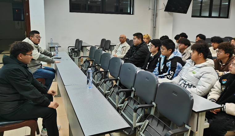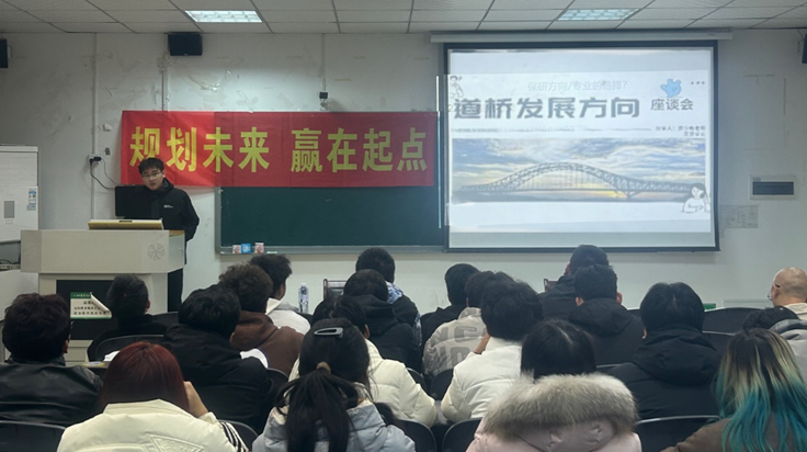 贾少敏分享他在道路桥梁与渡河工程领域学习、任教、科研以及参与社会服务的经验和心得,尤其是从行业发展趋势、职业规划建议、技能提升方法等多个方面进行了深入浅出地讲解。吴昊分享了他在大学四年的学习经历和保研相关的经验启示与技巧心得。在互动环节中,班级同学们积极提问,积极与贾少敏老师和吴昊同学进行交流。