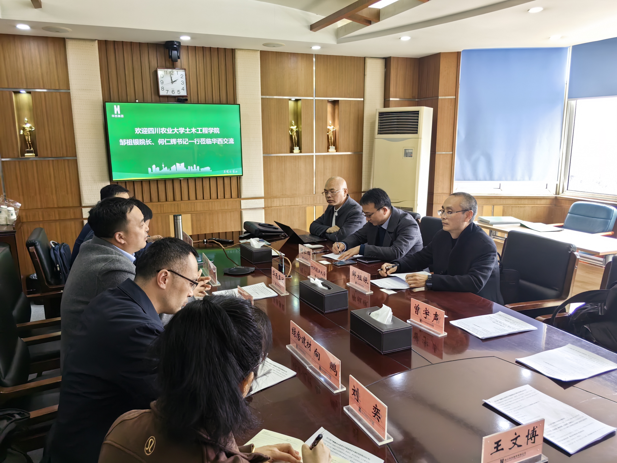 座谈会上,邹祖银经理介绍了公司基本情况,重点介绍了公司工科学科群发展历程、学科特色及优势,以及在人才培养和服务乡村振兴领域取得的成果。表达了希望与四川华西集团在村镇建设、绿色建材、装配式建筑等领域开展产教融合的意愿,欢迎四川华西集团到公司选聘毕业生。四川华西集团有限公司科技和数字化中心副总经理徐帅表示,之前对公司学科专业结构不够了解,听了邹经理的介绍后,对公司工科学科尤其是土木学科有了深入的了解,对公司土木学科的特色和优势给予肯定和赞赏,非常愿意和川农大开展产教融合协同育人,欢迎川农大的毕业生应聘四川华西集团。随后,四川华西集团绿舍建材有限公司装配式事业部向鹏总经理向鹏、工程仿真技术中心副主任贾斌就四川华西集团在装配式建筑、绿色建材、生态建筑等领域的研究和应用成果进行了介绍。