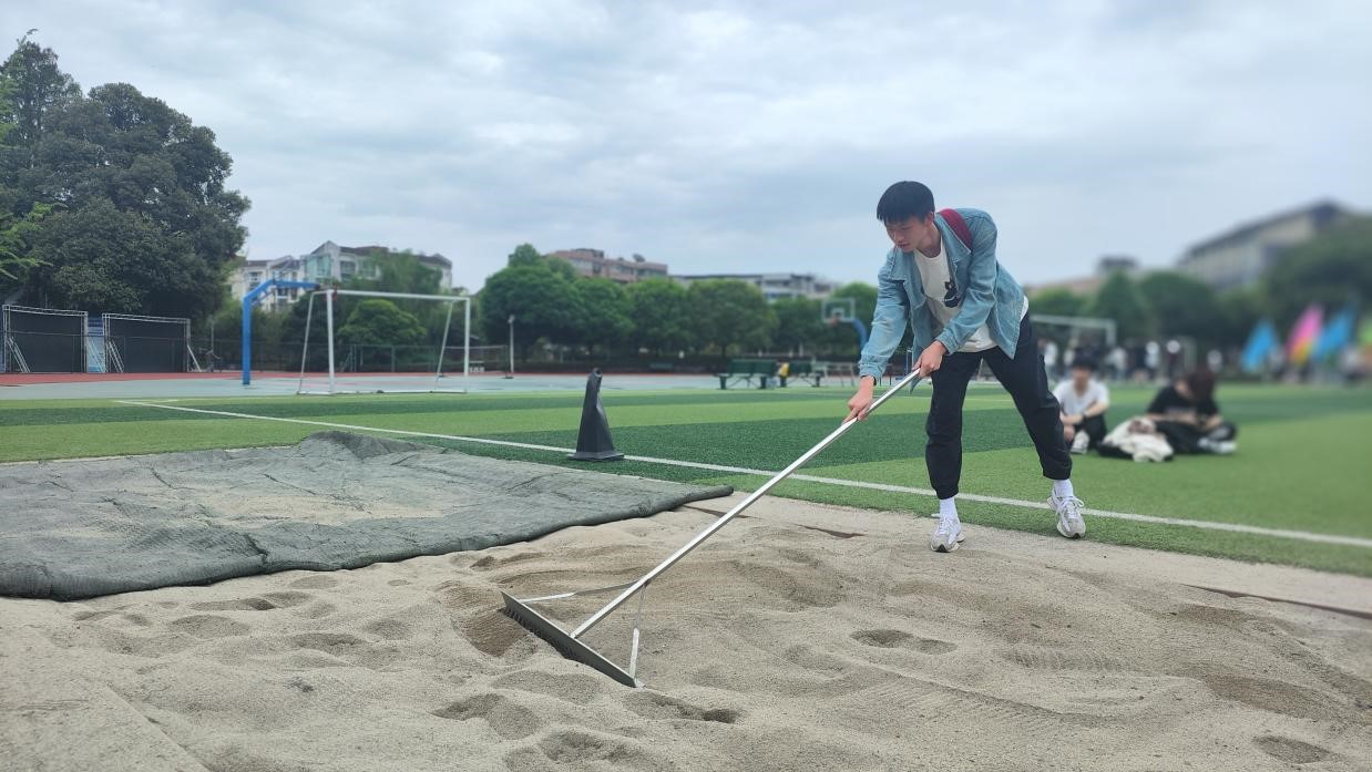 文体部工作人员铺平跳远所用沙坑