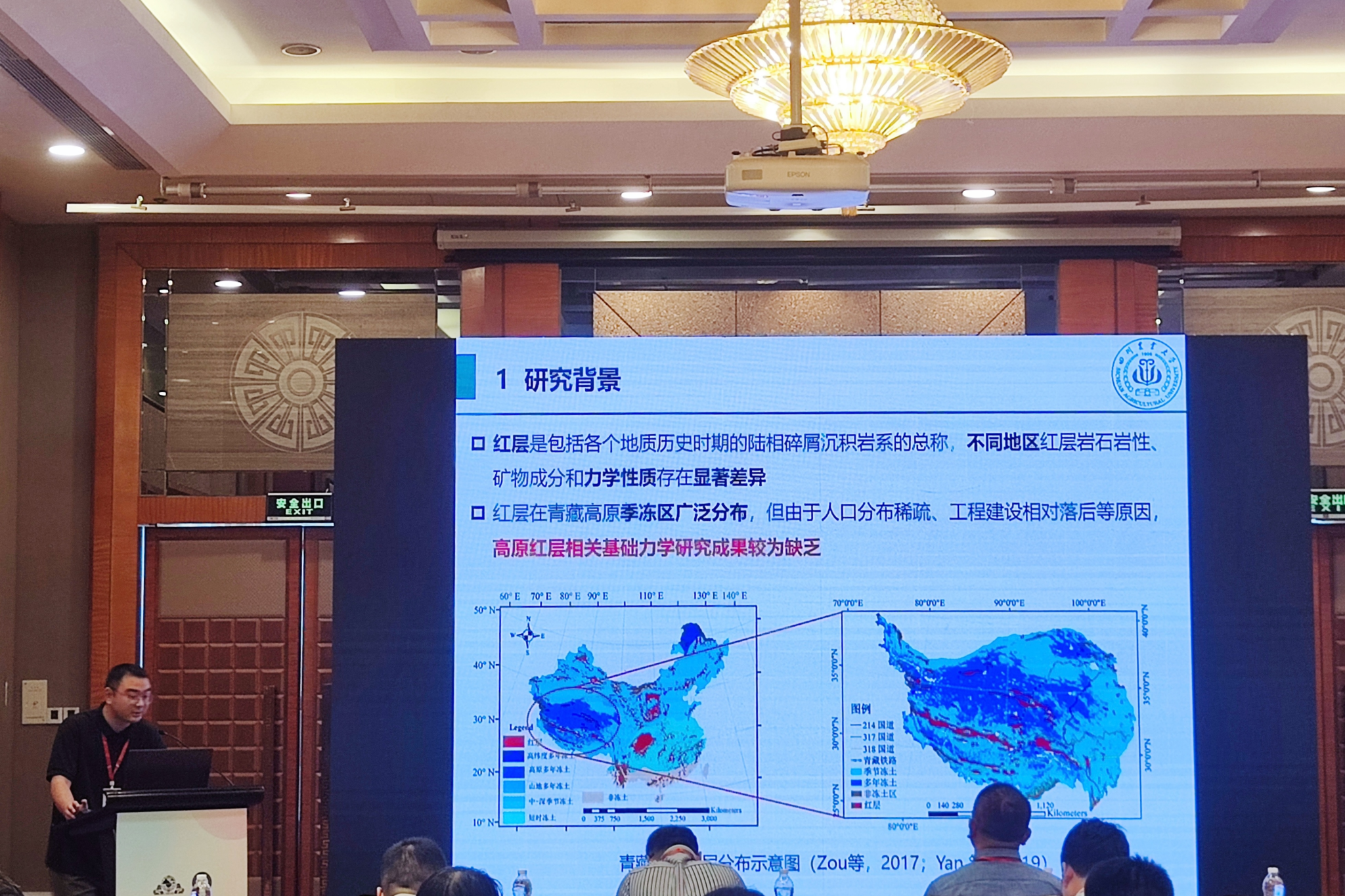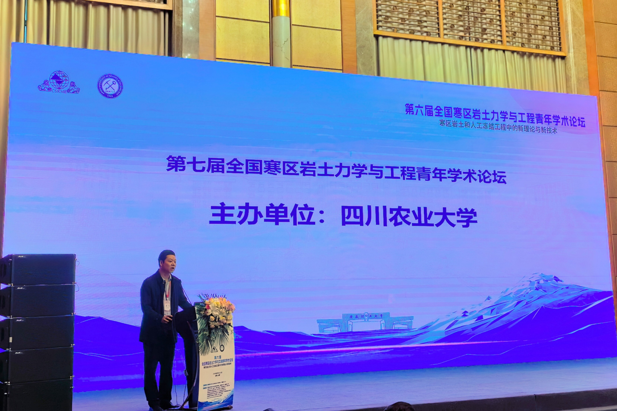 论坛期间,罗飞副教授作为下一届会议承办单位代表作特邀报告,介绍了太阳成集团tyc33455cc及太阳成集团tyc33455cc的办学历史、专业及硕士点情况,并向参会专家发出热情邀请,随后参加了会旗交接仪式。4月27日论坛分会场报告期间,何俊霖博士在“寒区岩土材料力学特性与本构关系”报告专题中作了《红层砂岩冻融劣化特性及多尺度本构模型》的分会场报告,介绍了课题最新研究成果。