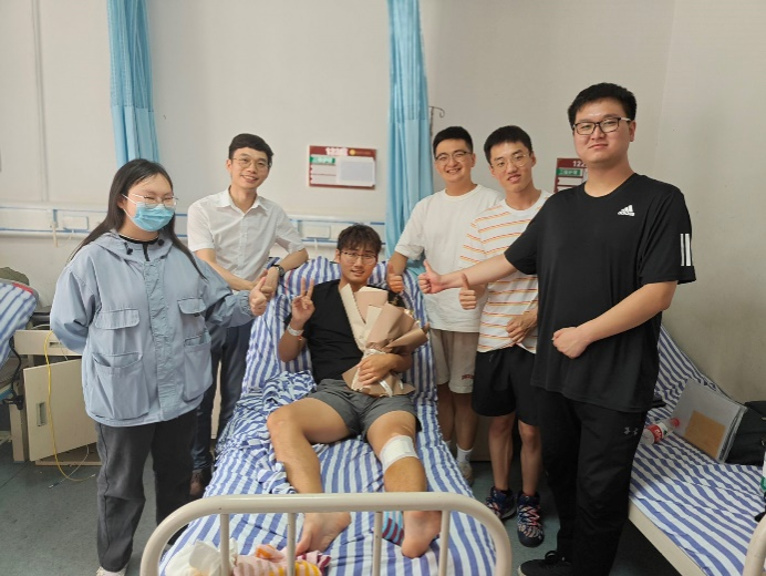 五月份,吴昊同学意外受伤,经医院检查后,发现左腿韧带与半月板损伤严重,在医生建议下于5月28日接受了手术治疗。吴昊同学家乡是来自千里之外的安徽省安庆市,家属无法及时赶到,得知吴昊受伤后,班级同学积极关心、罗斌老师高度重视。