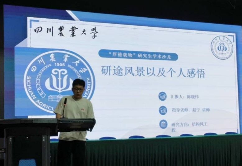 陈晓伟从个人介绍、研究背景、研究内容和科研建议四个方面为大家进行学术分享。他首先讲述了自己如何从川农结缘到川农扎根,在川农的“研途之旅”中潜心科研,最终被东南大学录取博士研究生。“风”与他整个学术研究形影相随,其硕士论文的主要组成部分就是低矮建筑/大跨度结构风压场的重建和基于机器学习的低矮建筑风压场预测,研究期间,他发表了三篇SCI论文,其中两篇为中科院TOP期刊。在分享接近尾声时,陈晓伟希望各位研究生们时刻保持清晰的头脑,明确自己的目标,以乐观向上的态度,在科研的路上付诸努力并挥洒汗水,这样才能不负青春、不负韶华。
