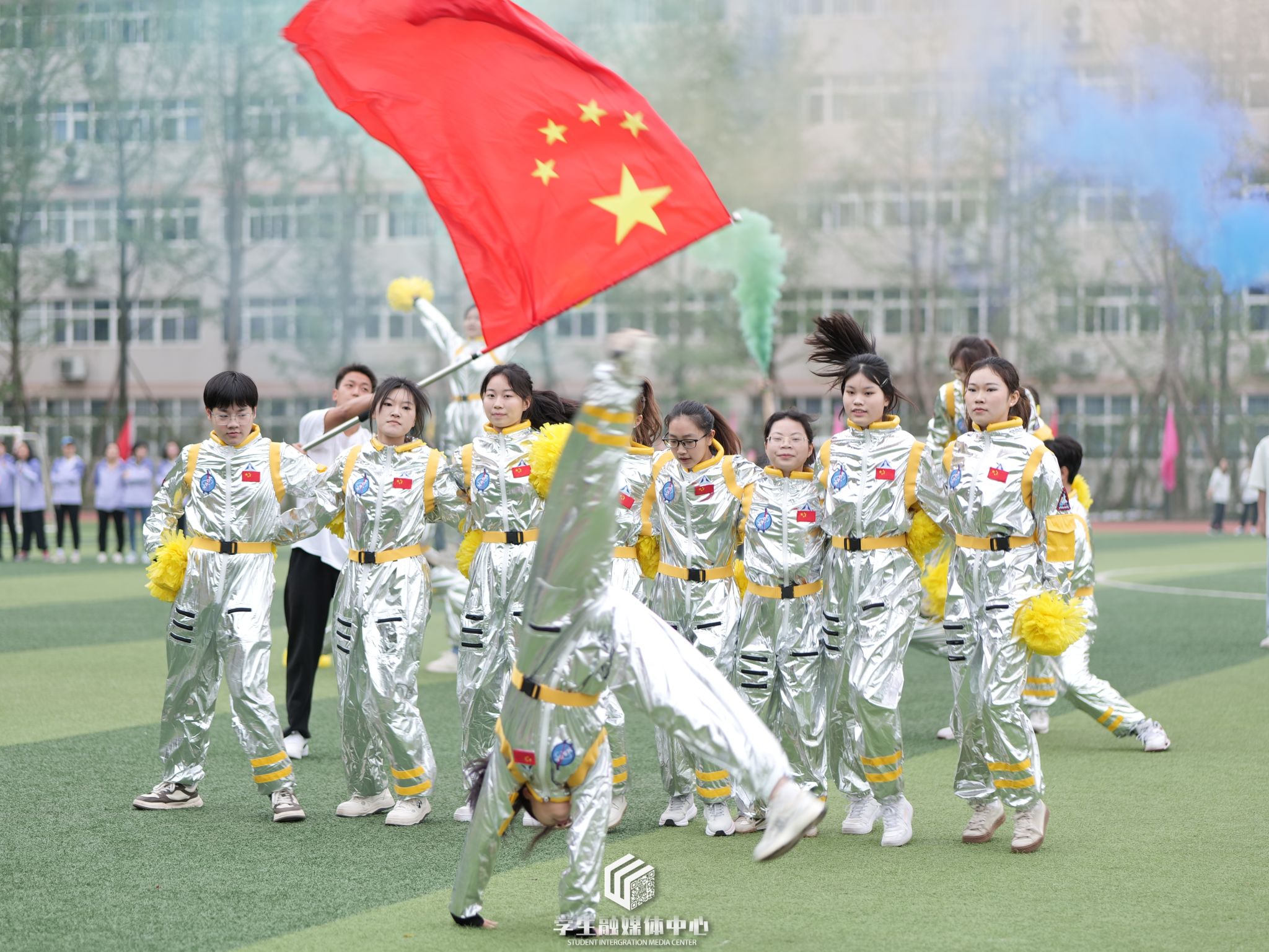 在健美操比赛中,公司学子紧贴时事以学习航天精神为指引,通过别出心裁的表演成为全场焦点。其中,我班崔永欣等6名同学身着亮眼服装,在节奏律动中尽显青春活力。古余同学身着太空人服装于队列前挥舞国旗,红旗飘扬,彰显着青年拳拳科技强国之心。