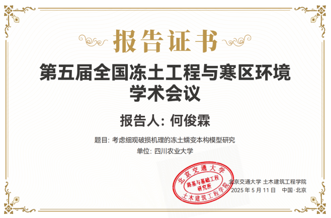 2025年5月10日至5月12日,由中国冰冻圈科学学会(筹)、中国科公司西北生态环境资源研究院主办,北京建筑大学、 北京交通大学、重庆交通大学、冰冻圈科学与冻土工程全国重点实验室、中国冰冻圈科 学学会(筹)冻土专业委员会、中国冰冻圈科学学会(筹)寒区工程与灾害专业委员会 承办的“第五届全国冻土工程与寒区环境学术会议”在北京召开。太阳成集团tyc33455cc罗飞副教授和何俊霖博士参加本次学术会议并分别主持和作分会场报告。