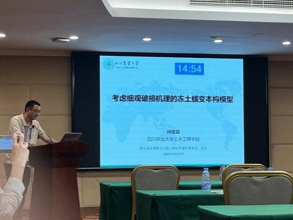 会议期间,罗飞副教授主持“寒区重大工程实践”主题分会场报告。何俊霖博士在“冻土力学与冻土物理学”主题分会场作了《考虑细观破损机理的冻土蠕变本构模型研究》的学术报告,报告内容以寒区冻土蠕变灾害防治为背景,介绍了考虑细观破损机理的冻土蠕变本构模型理论研究成果。两位老师与参会的专家学者进行了深入交流和积极探讨,为后续科研工作提供了有益帮助。