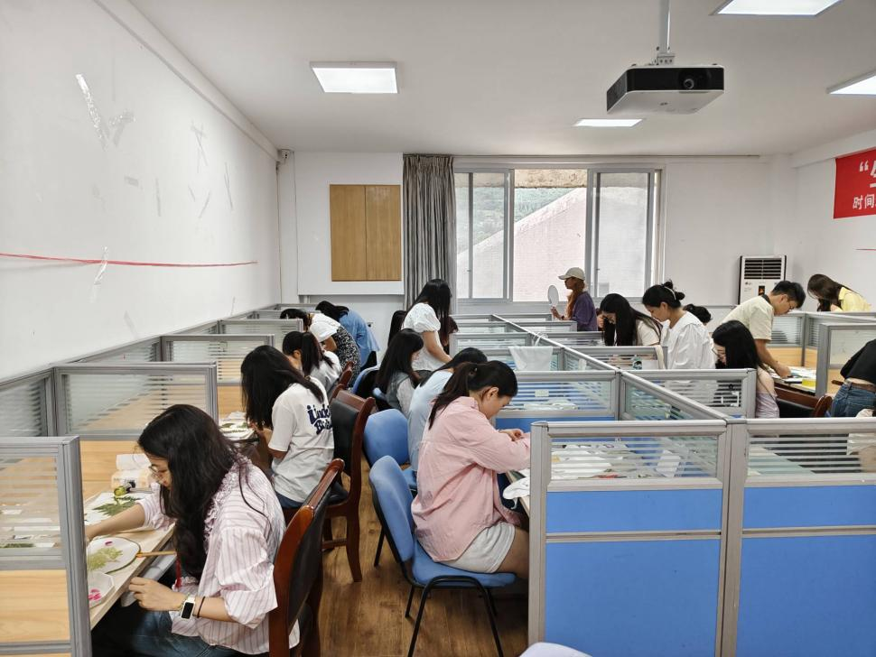 本次活动以“自然疗愈,拓染心灵”为主题,参与者在主办方的指导下,运用新鲜花瓣、树叶等自然材料,通过敲打、拓印等传统工艺,将植物的纹理与色彩永久保留在布料上。活动现场氛围轻松愉悦,同学们在创作过程中不仅体验了传统手工艺的乐趣,也在互动交流中增进了情感联结。