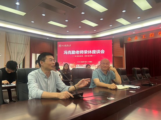 会议第二阶段,在冯克勤老师荣休座谈会上,冯老师分享了自己39年的从教生涯。他结合自身教学与科研经历,从课程设计、师生互动、团队协作等方面倾囊相授。在场教师纷纷发言,回忆与冯老师共事的难忘瞬间,表达对其专业能力与人格魅力的钦佩。副书记赵中国代表公司及部门工会向冯克勤老师献上鲜花,感谢他39年来为公司教学、科研及人才培养作出的贡献,并送上对其退休生活的美好祝福。