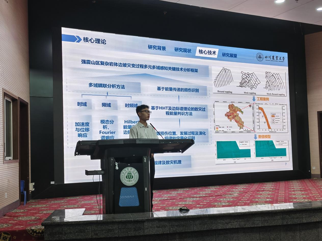 徐大凯则聚焦“强震山区复杂岩体边坡灾变过程多元多域感知关键技术”研究方向,分享了在岩体边坡水力-动力耦合灾变效应、地质灾害监测预警及防控领域的科研成果。他已发表三篇SCI论文,其中第一作者一篇。徐大凯同学从个人科研背景引入,讲述了如何从实际工程问题中提炼科研课题,分享了监测数据采集、室内模拟实验分析的经验,强调理论与实践结合对土木工程学科科研的重要性。他还结合自身经历,为同学们梳理科研时间规划、论文写作技巧,鼓励大家积极参与科研项目,在实践中提升解决复杂工程问题的能力。