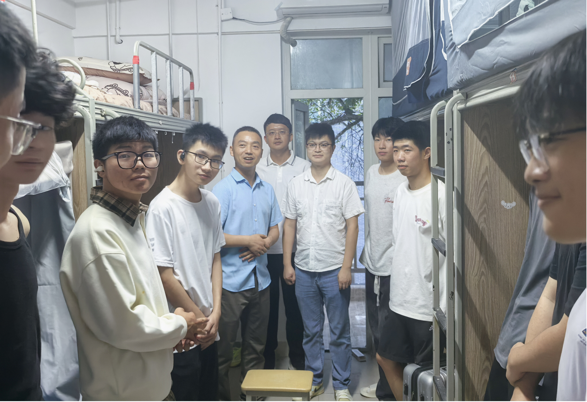 9月10日晚7点,太阳成集团tyc33455cc经理邹祖银、党委书记何仁辉、党委副书记赵中国、副经理郭子红以及14位新生班主任共同走访了64间新生寝室,亲切看望2025级新生,深入了解同学们的入学适应情况,并送上公司的关心与问候。