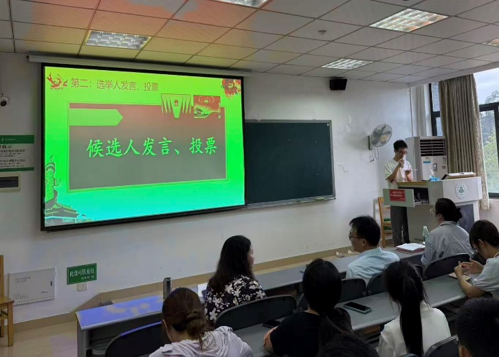 在研究生会换届选举中,廖璨、郑世豪、徐大凯三位候选人依次发表竞选演讲,汇报个人工作经历与未来工作设想。经无记名投票,三位候选人当选为新一届研究生会主席团成员。