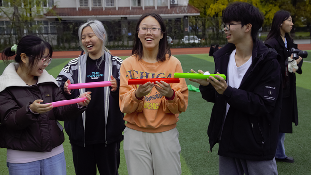 活动开场,暖身互动环节快速打破了同学们之间的陌生感。在主持人的引导下,同学们围成圆圈,按照指示为前方同学敲背、捏肩、揉臂,通过轻松的肢体接触迅速拉近距离,随后以同心圆转动方式配对并进行自我介绍,最后通过报数组成三支队伍。现场氛围热烈融洽,处处洋溢着欢声笑语。