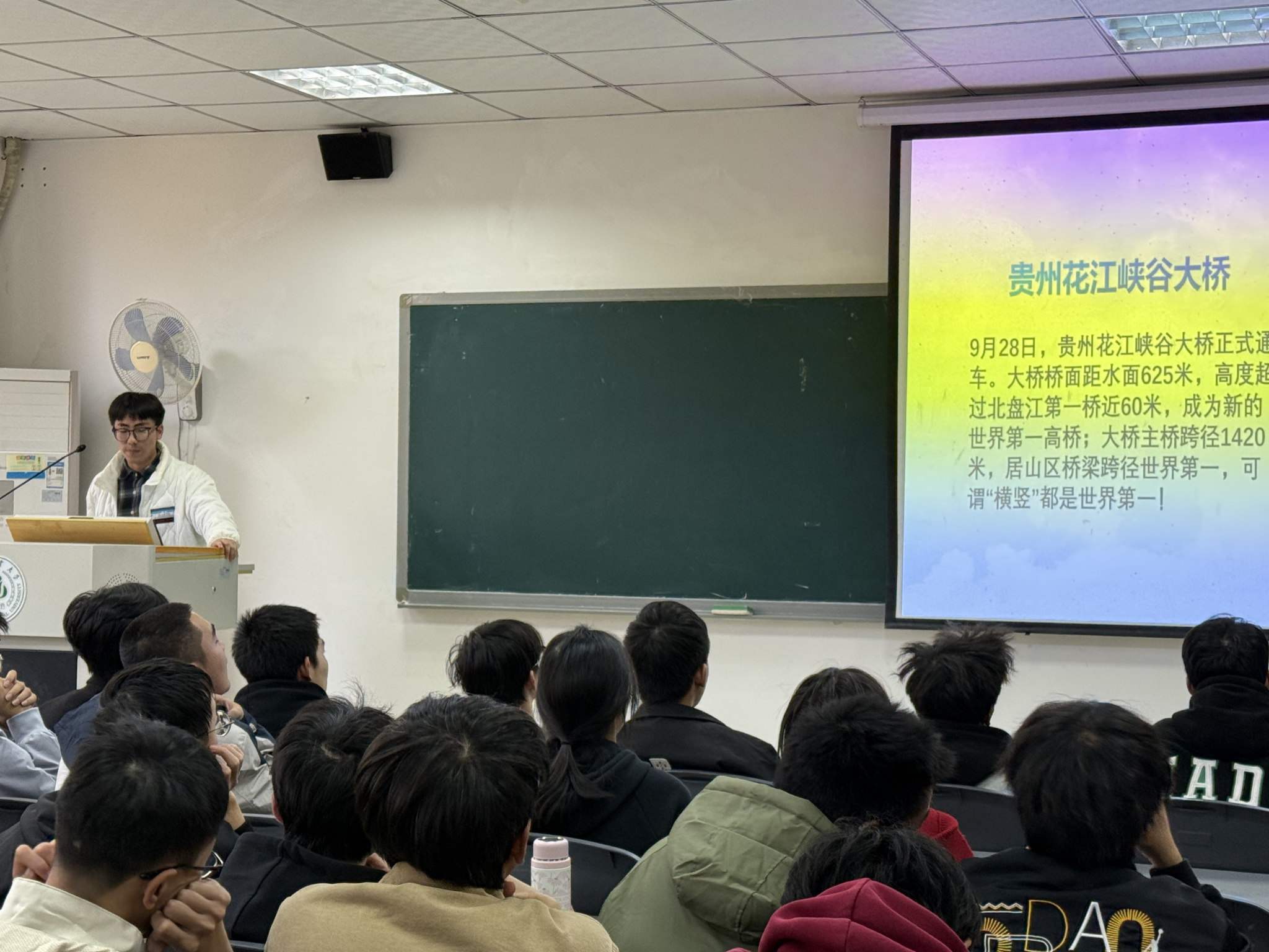 随后,保送至清华大学的孙孟熙学长以近日正式通车的“贵州花江峡谷大桥”这一重大工程实例引入,铿锵有力地指出:“土木工程大有可为,道路桥梁与渡河专业大有可为!”他呼吁同学们要坚定专业信心,切勿被网络上的片面传言所困扰。