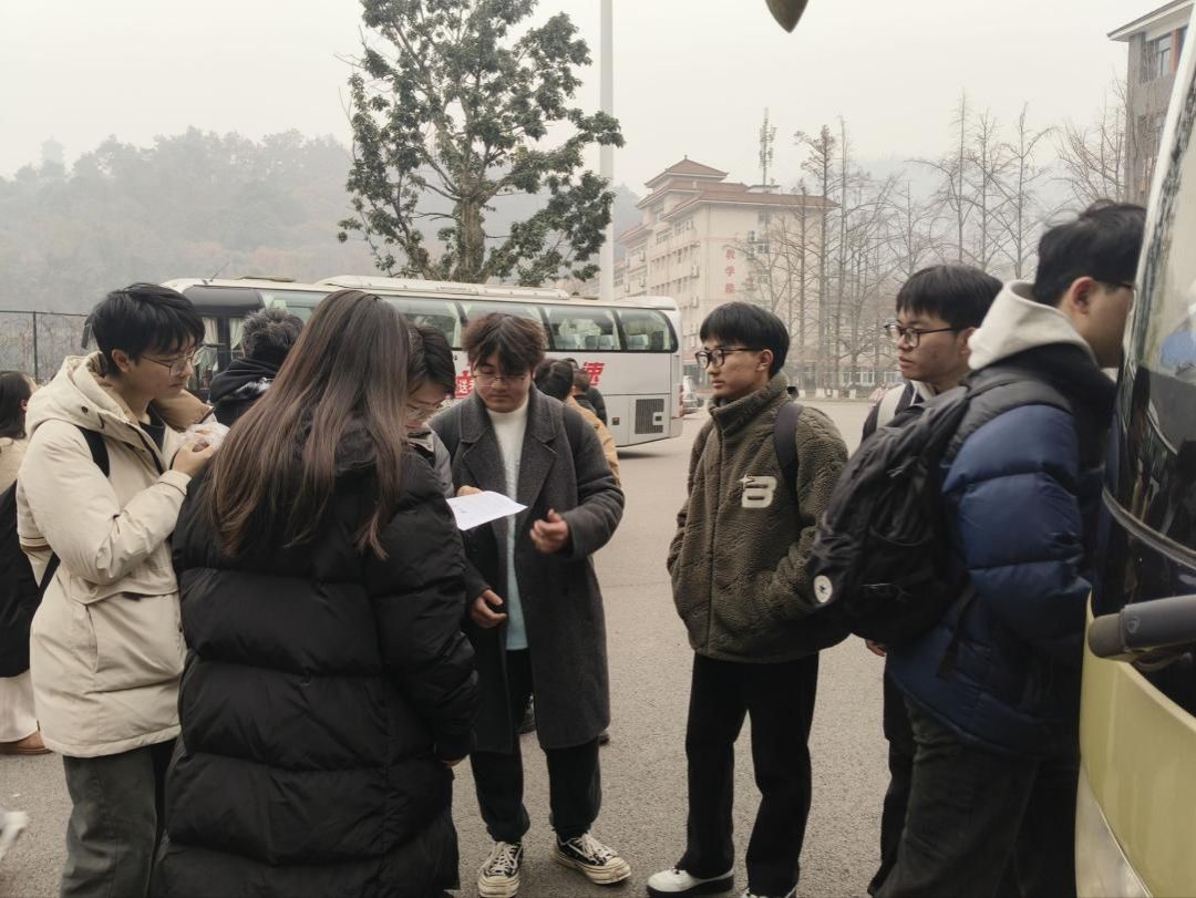 晨光熹微,薄雾轻笼。12月19日上午九点四十五分,都江堰校区活动中心前,两辆贴着“川农太阳成集团tyc33455cc温暖送考,祝所有学子一战成硕”横幅的送考大巴静静停驻,等待着61名即将奔赴考场的学子。